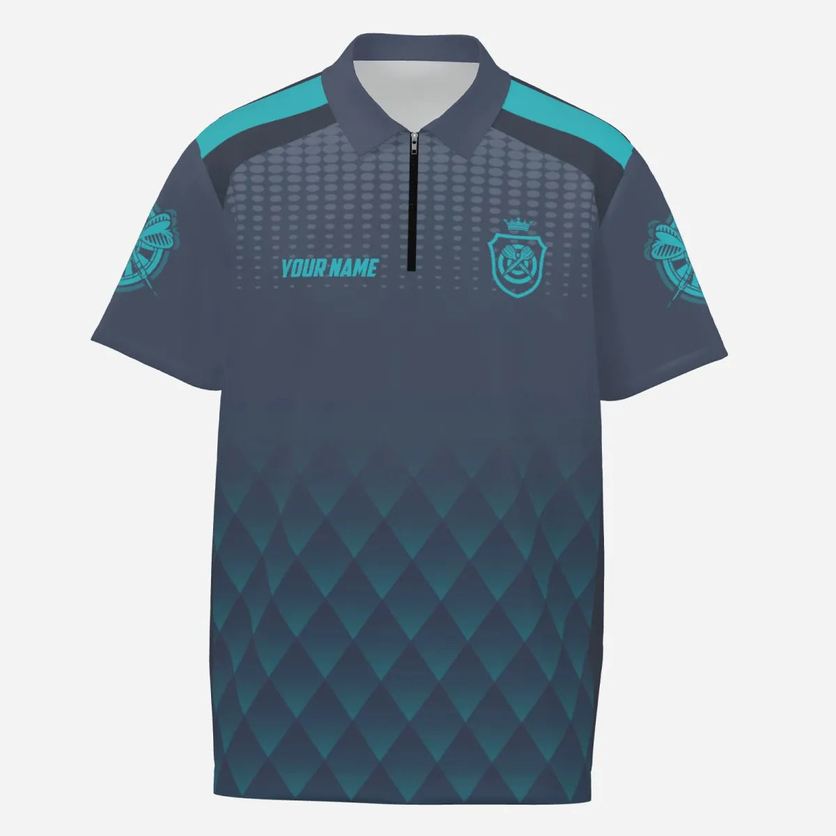 🎯 Gepersonaliseerd dartshirt - Heren dartshirt met kwartrits en geometrisch patroon in blauw-marineblauw - Essential Darting Jersey M237