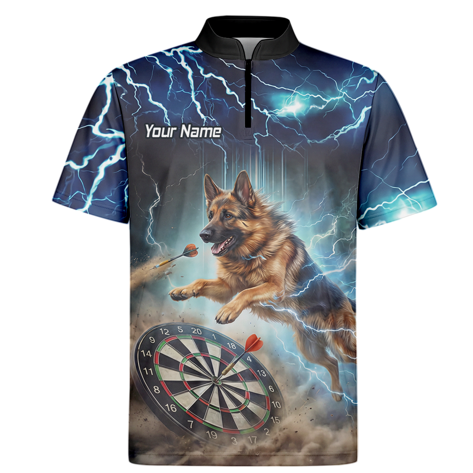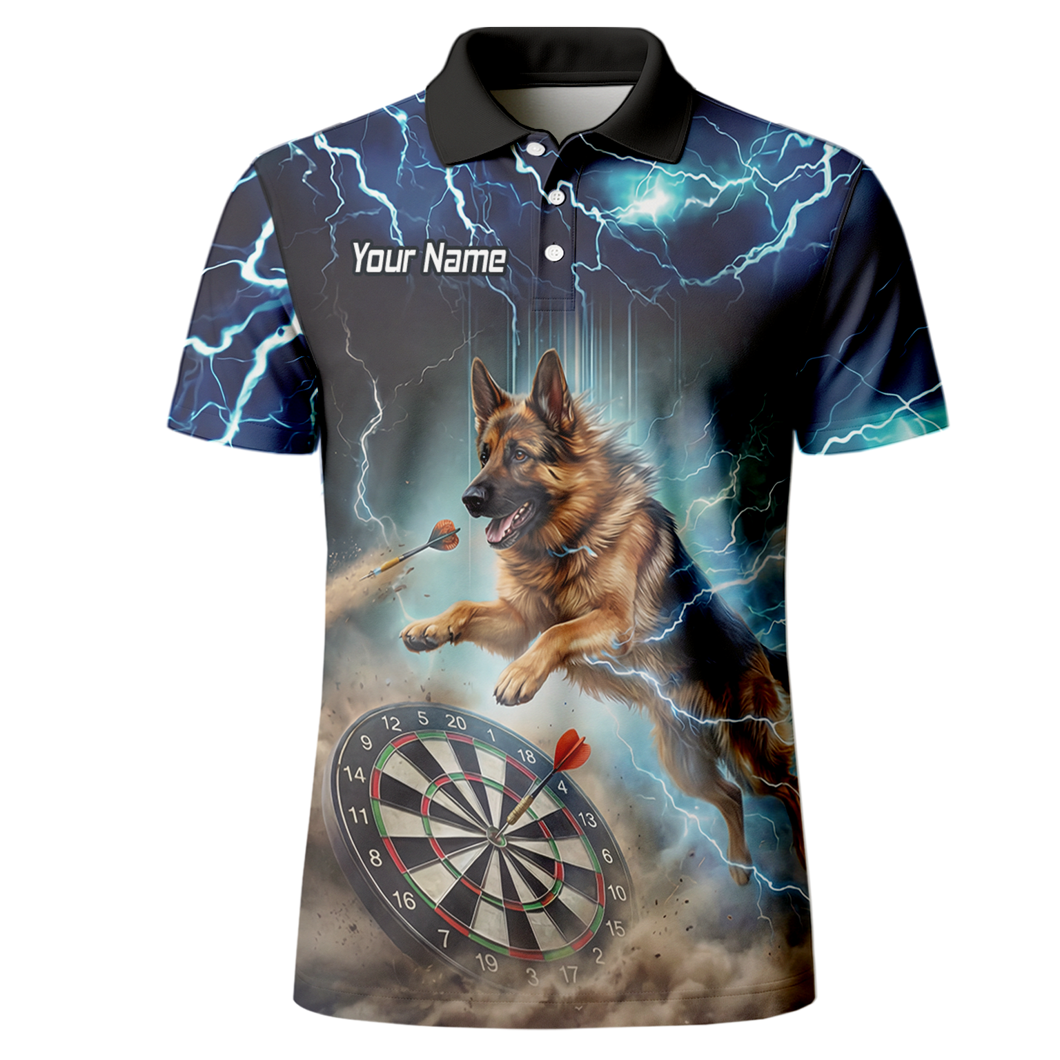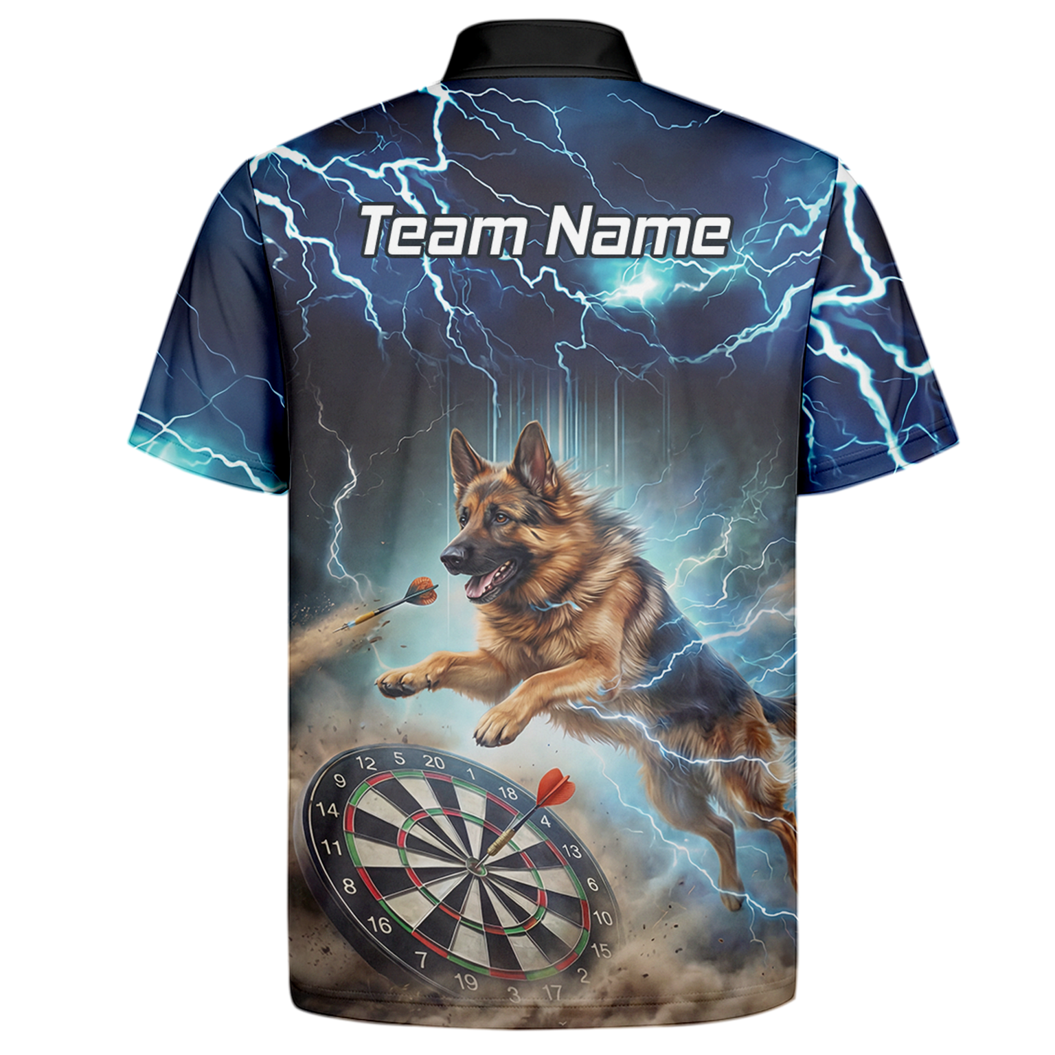 Custom Storm Blue Dart Shirt – Lightning Alsatian Dog Design with Name & Team Personalisation H92021
