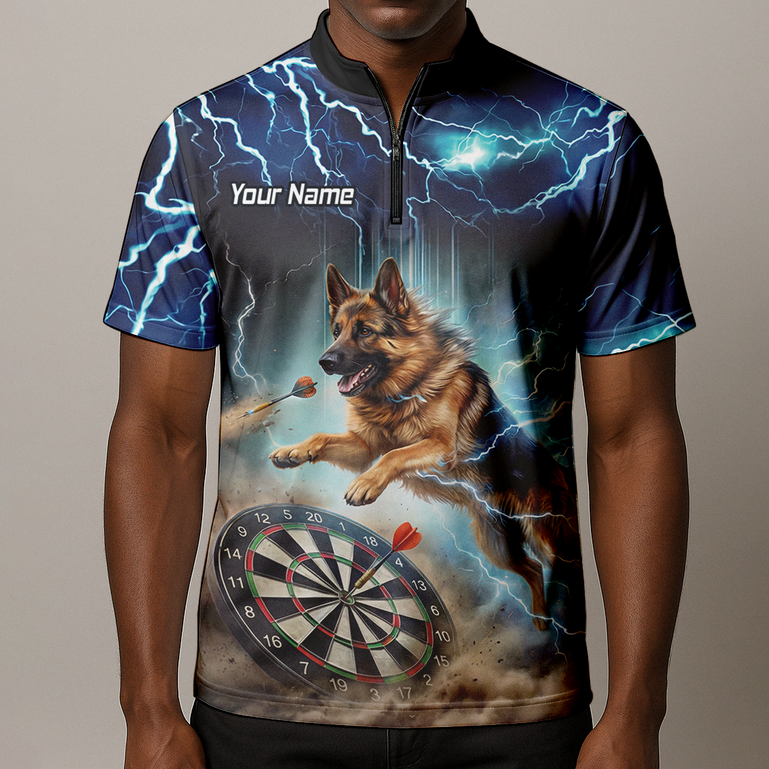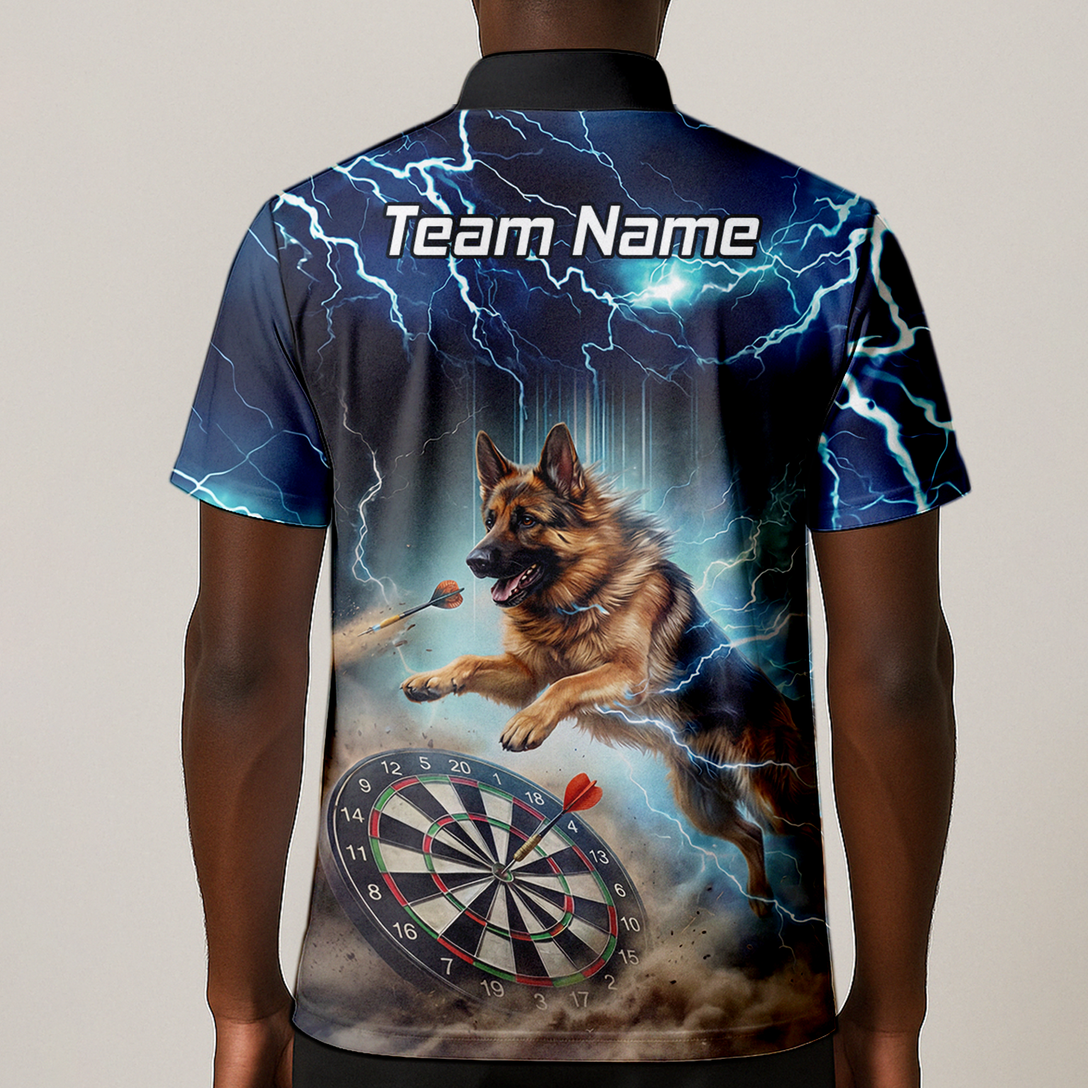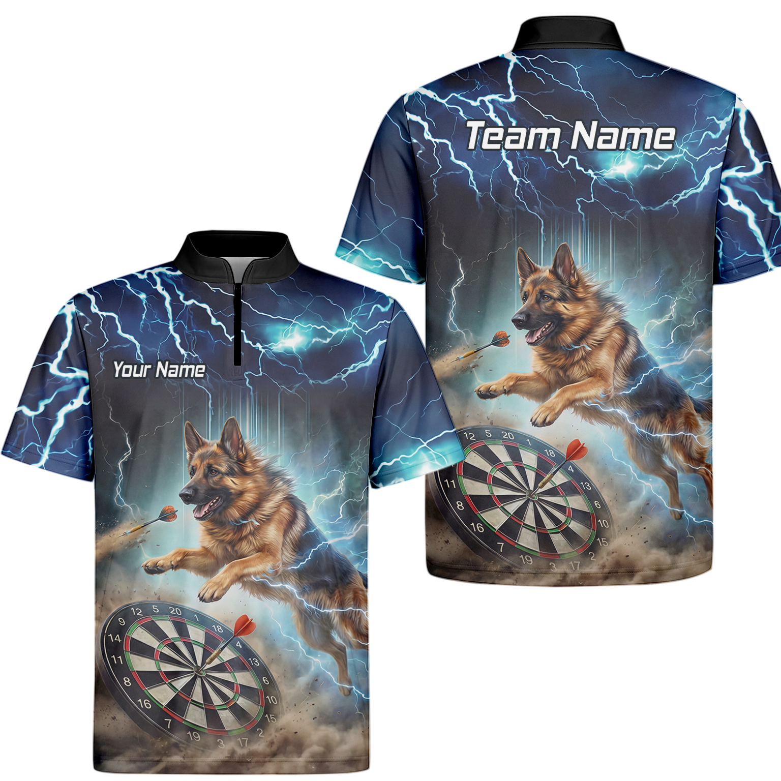 Custom Storm Blue Dart Shirt – Lightning Alsatian Dog Design with Name & Team Personalisation H92021